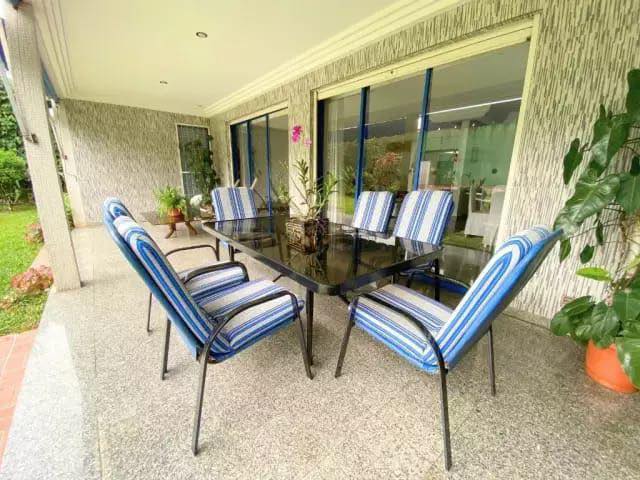 Les extérieurs proposent un grand jardin arboré, une piscine et un garage, le tout dans un cadre sécurisé.